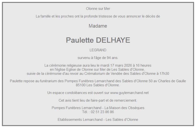 Cet espace « condoléances » est dédié à la mémoire de Madame Paulette LEGRAND née DELHAYE.