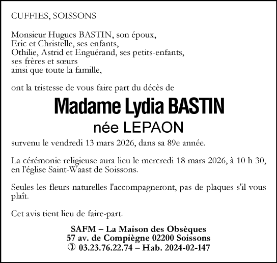 Cet espace « condoléances » est dédié à la mémoire de Madame Lydia BASTIN née LEPAON.