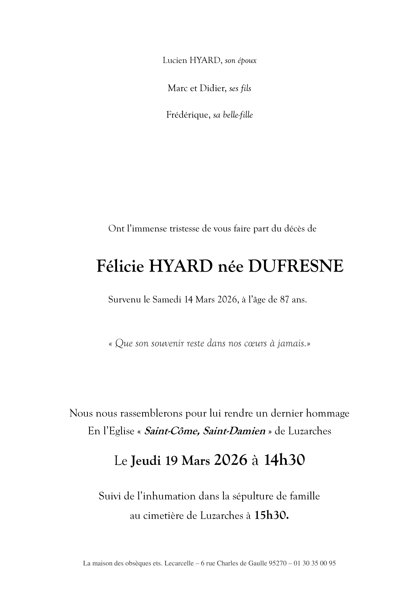 Cet espace « condoléances » est dédié à la mémoire de Madame Félicie HYARD née DUFRESNE.