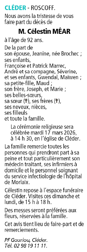Décédé à Morlaix (29600) le vendredi 13 mars 2026