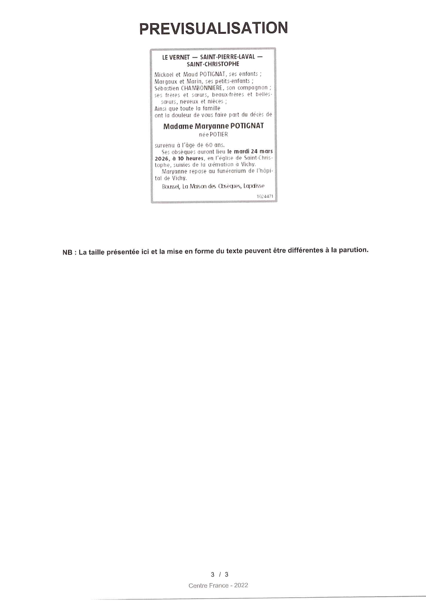 de Madame Maryanne POTIGNAT née POTIER