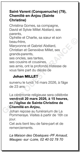 Cet espace « condoléances » est dédié à la mémoire de Monsieur Johan MILLET.