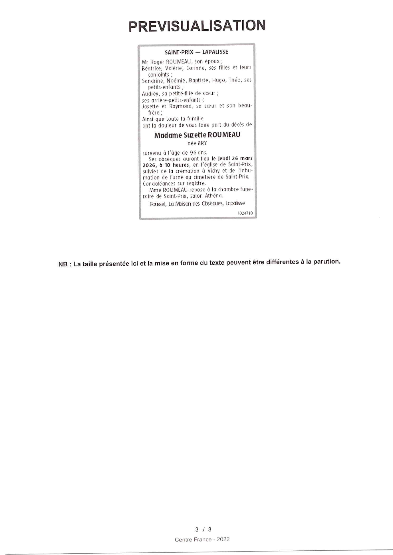 de Madame Suzette ROUMEAU née BRY