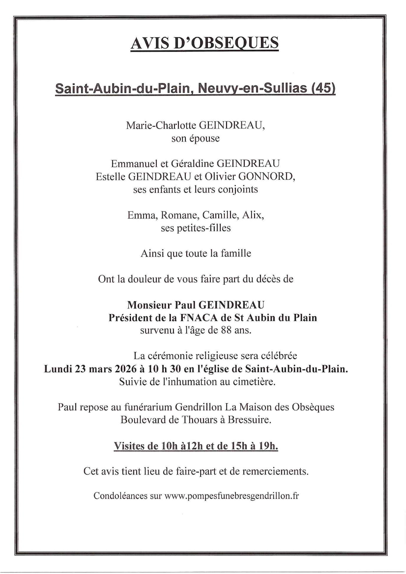 Cet espace « condoléances » est dédié à la mémoire de Monsieur Paul GEINDREAU.