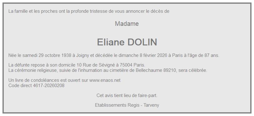Cet espace « condoléances » est dédié à la mémoire de Madame Eliane DOLIN.