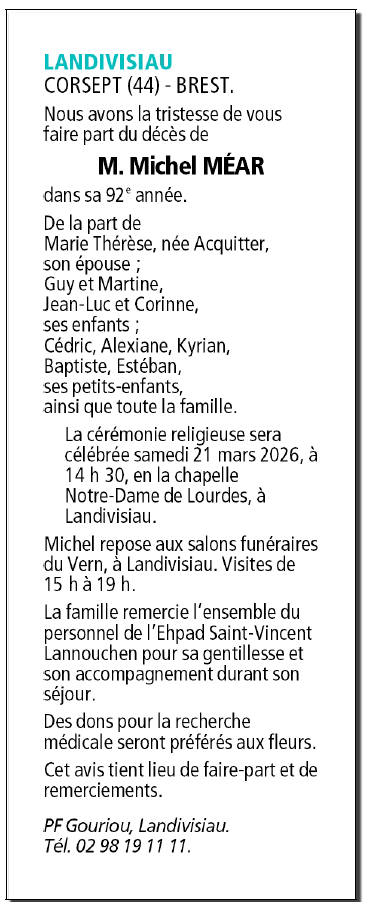 Décédé à Landivisiau (29400) le mercredi 18 mars 2026