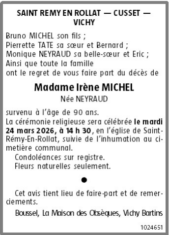 Cet espace « condoléances » est dédié à la mémoire de Madame Irène MICHEL née NEYRAUD.