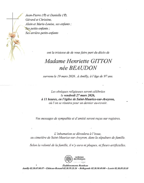 Cet espace « condoléances » est dédié à la mémoire de Madame Henriette GITTON née BEAUDON.