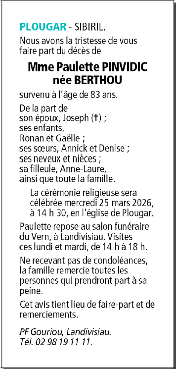 Décédée à Plougar (29440) le samedi 21 mars 2026