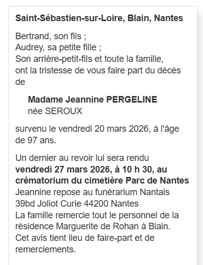 Cet espace « condoléances » est dédié à la mémoire de Madame Jeannine PERGELINE née SEROUX.