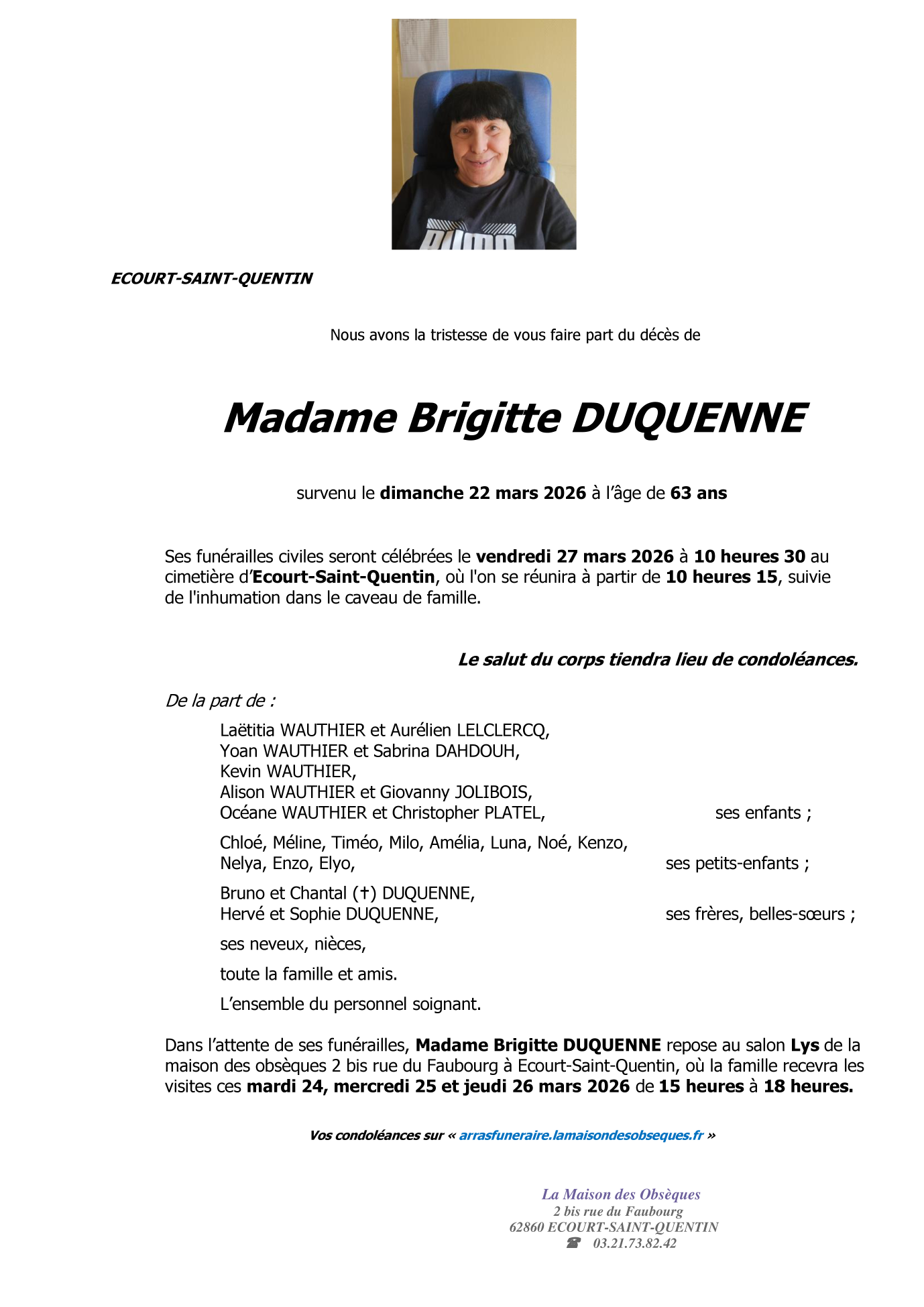 Cet espace « condoléances » est dédié à la mémoire de Madame Brigitte DUQUENNE.