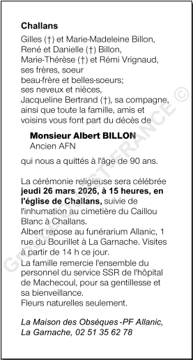 Cet espace « condoléances » est dédié à la mémoire de Monsieur Albert BILLON.