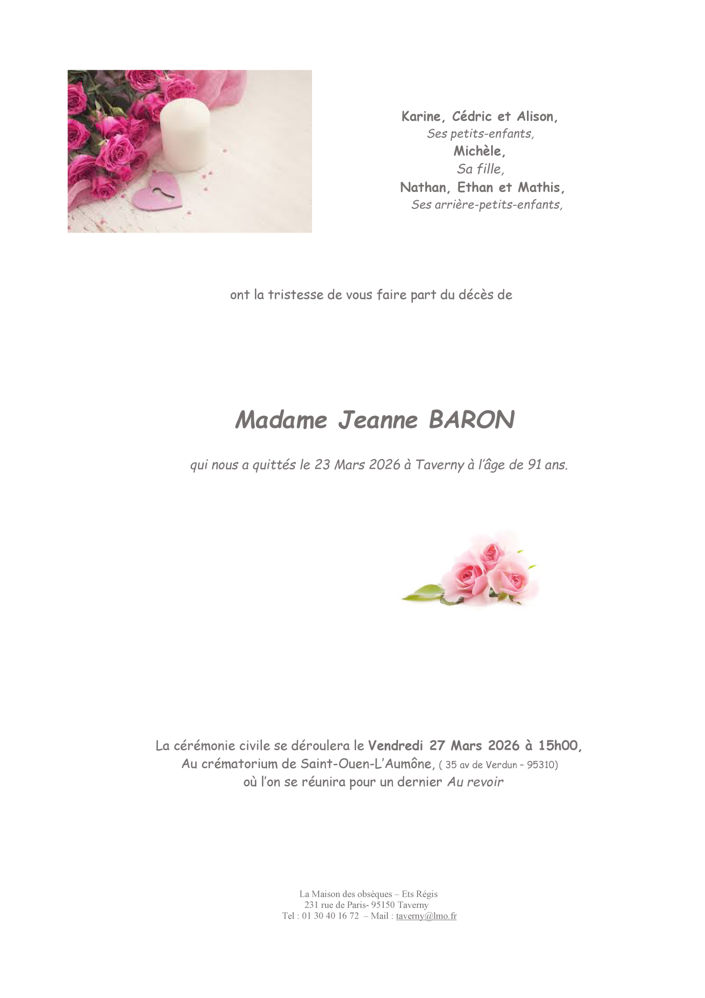 Cet espace « condoléances » est dédié à la mémoire de Madame Jeanne BARON.