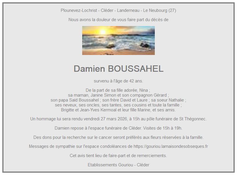 Cet espace « condoléances » est dédié à la mémoire de Monsieur Damien BOUSSAHEL.