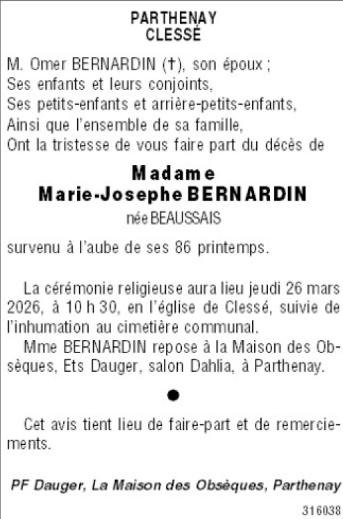 Cet espace « condoléances » est dédié à la mémoire de Madame Marie-Josephe BERNARDIN née BEAUSSAIS.