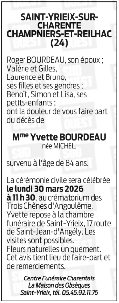 de Madame Yvette BOURDEAU née MICHEL