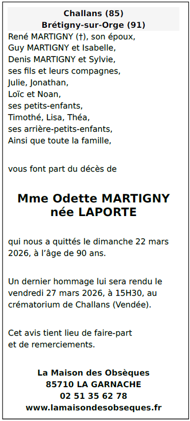Cet espace « condoléances » est dédié à la mémoire de Madame Odette MARTIGNY née LAPORTE.