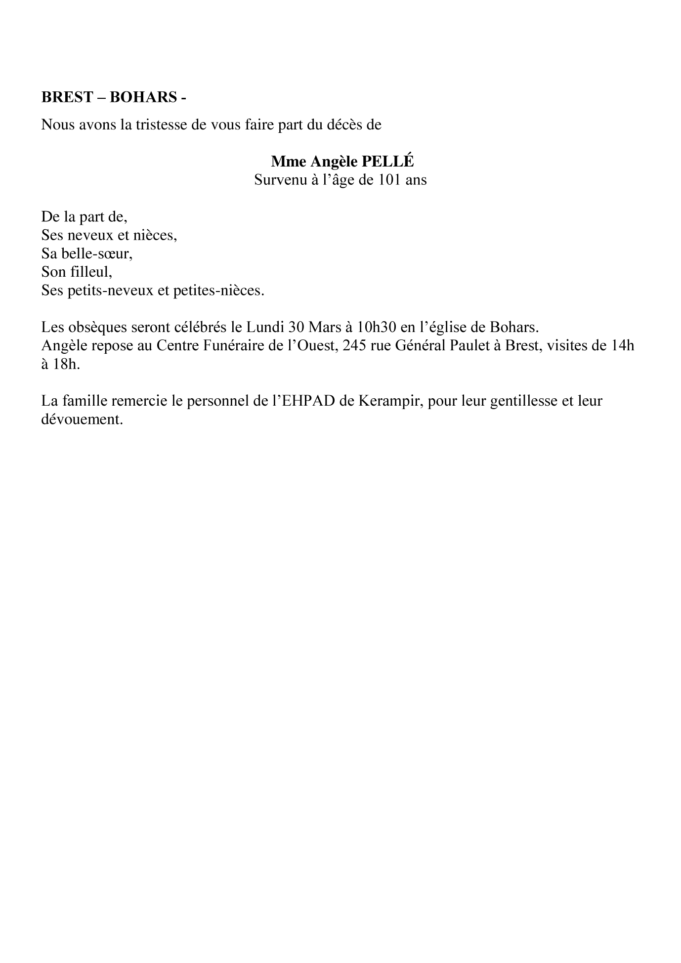 de Madame Angèle PELLÉ