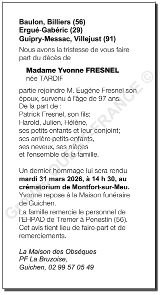 Cet espace « condoléances » est dédié à la mémoire de Madame Yvonne FRESNEL née TARDIF.