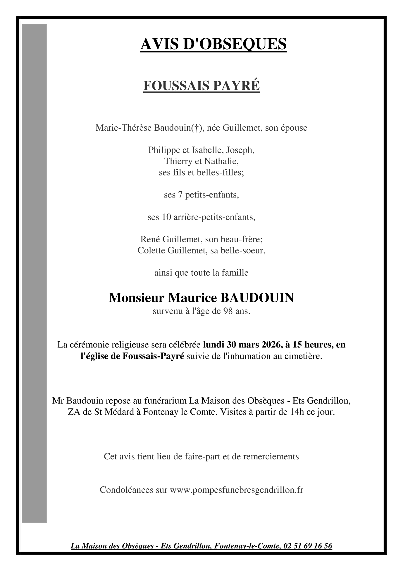 Cet espace « condoléances » est dédié à la mémoire de Monsieur Maurice BAUDOUIN.