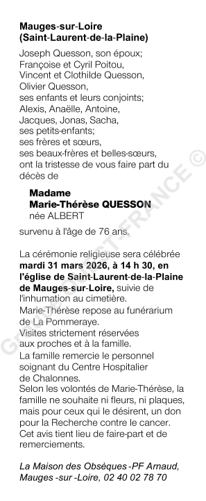 Cet espace « condoléances » est dédié à la mémoire de Madame Marie-Thérèse QUESSON née ALBERT.