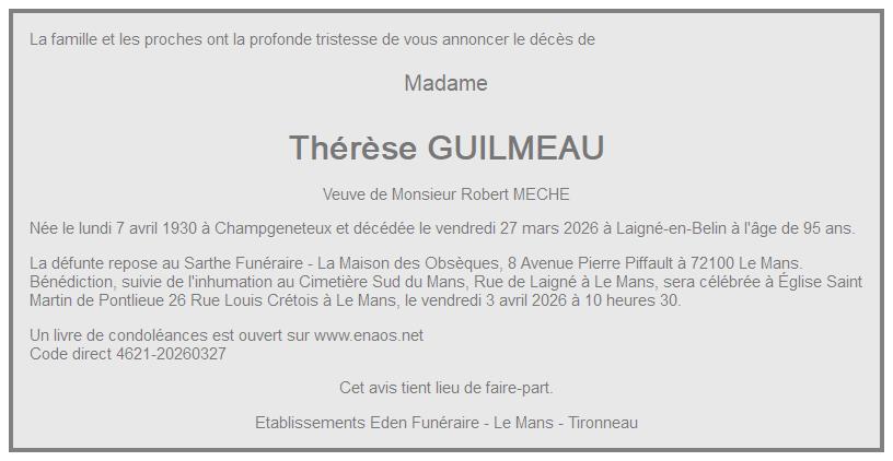 Cet espace « condoléances » est dédié à la mémoire de Madame Thérèse MECHE née GUILMEAU.