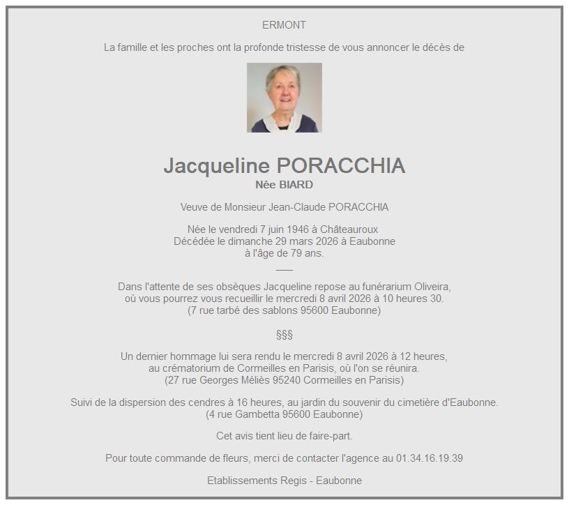 de Madame Jacqueline PORACCHIA née BIARD