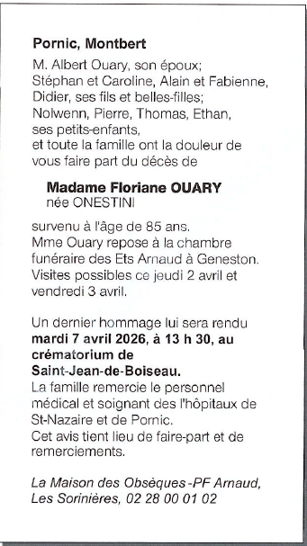 Décédée à Saint-Nazaire (44600) le lundi 30 mars 2026
