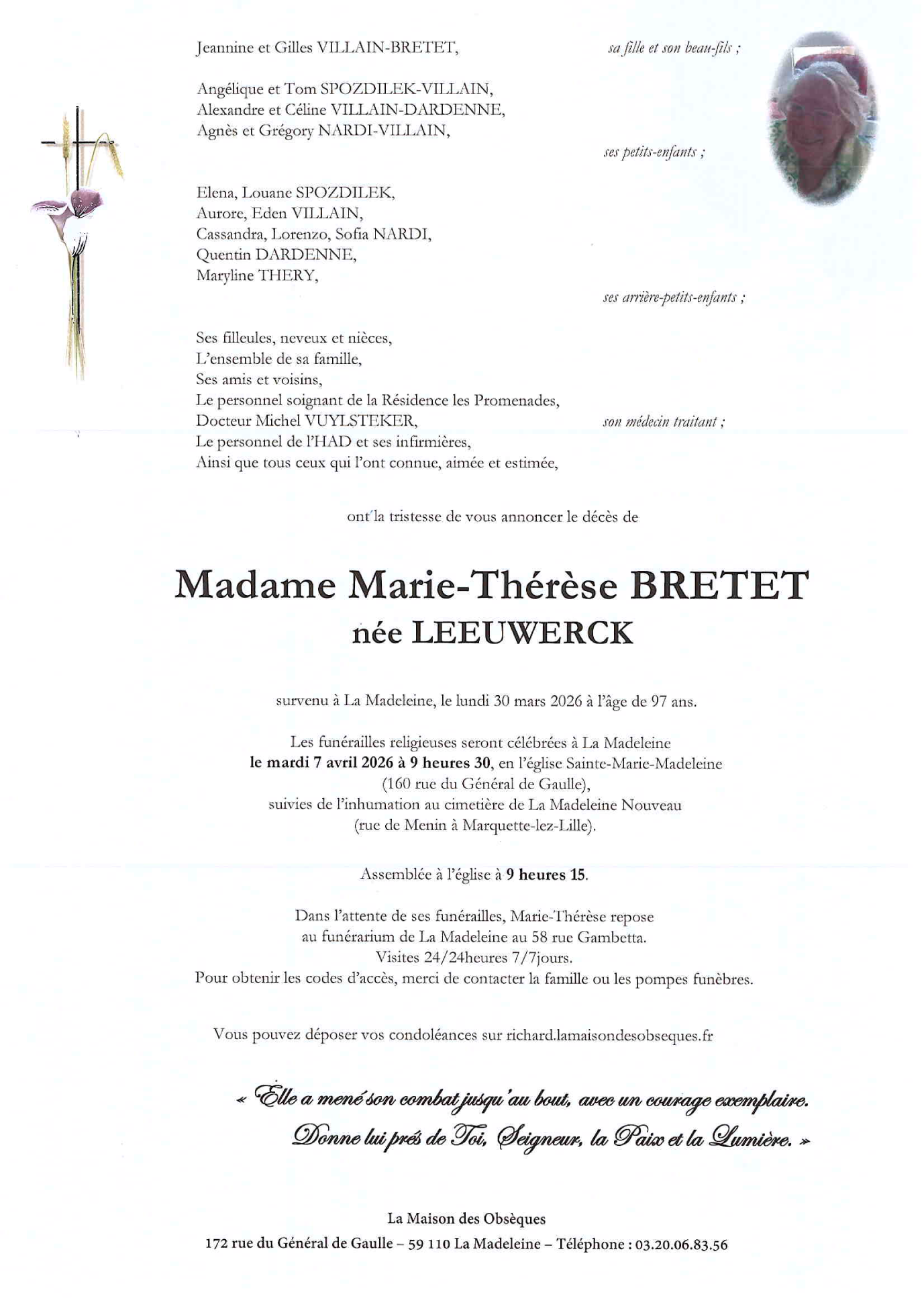 Cet espace « condoléances » est dédié à la mémoire de Madame Marie-Thérèse LEEUWERCK.