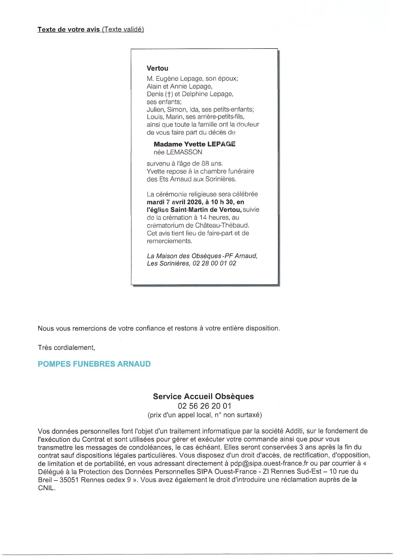 Cet espace « condoléances » est dédié à la mémoire de Madame Yvette LEPAGE née LEMASSON.