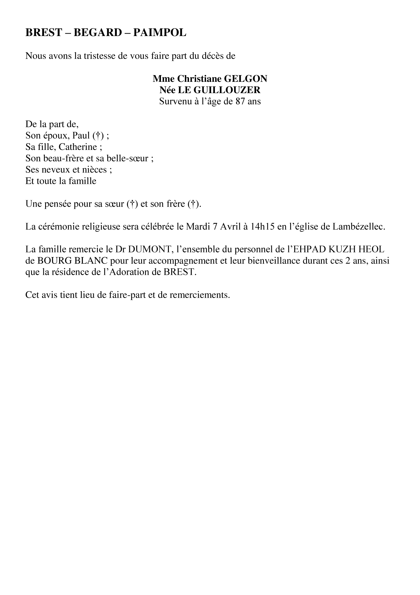 Cet espace « condoléances » est dédié à la mémoire de Madame Christiane GELGON née LE GUILLOUZER.