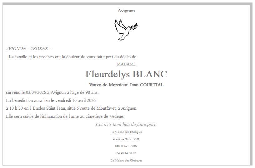 Cet espace « condoléances » est dédié à la mémoire de Madame Fleurdelys COURTIAL née BLANC.