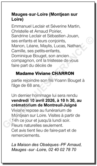 Cet espace « condoléances » est dédié à la mémoire de Madame Viviane CHARRON.