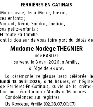 Cet espace « condoléances » est dédié à la mémoire de Madame Nadège THEGNIER née BARLOT.