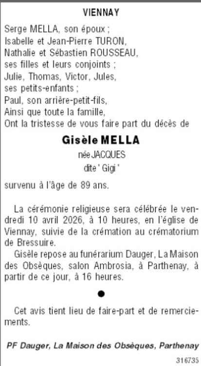 de Madame Gisèle MELLA née JACQUES