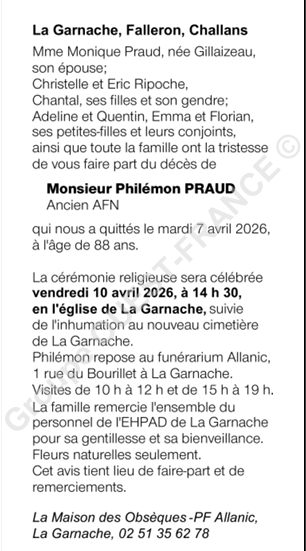 Cet espace « condoléances » est dédié à la mémoire de Monsieur Philémon PRAUD.