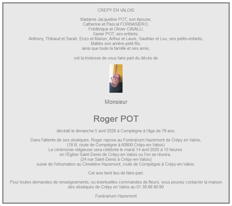 Cet espace « condoléances » est dédié à la mémoire de Monsieur Roger POT.