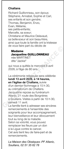 Cet espace « condoléances » est dédié à la mémoire de Madame Jacqueline GUILLONNEAU née MARTINET.