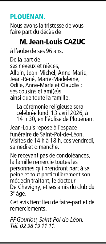 Décédé à Plouenan (29420) le jeudi 9 avril 2026