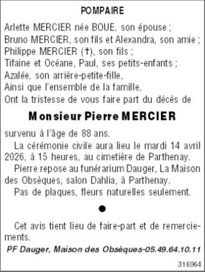 Cet espace « condoléances » est dédié à la mémoire de Monsieur Pierre MERCIER.