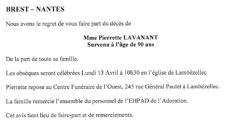 Cet espace « condoléances » est dédié à la mémoire de Madame Pierrette LAVANANT.
