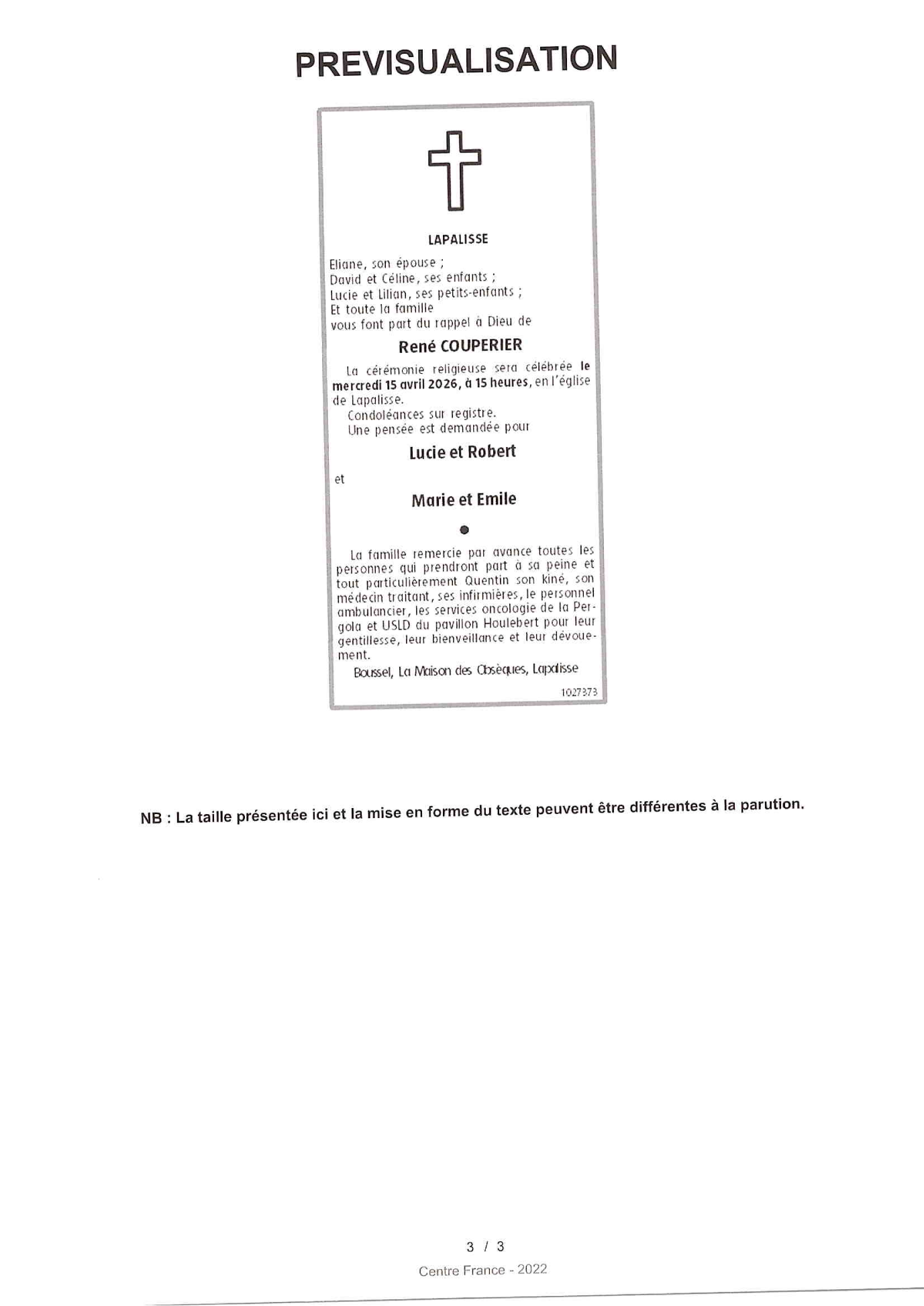 Cet espace « condoléances » est dédié à la mémoire de Monsieur René COUPERIER.