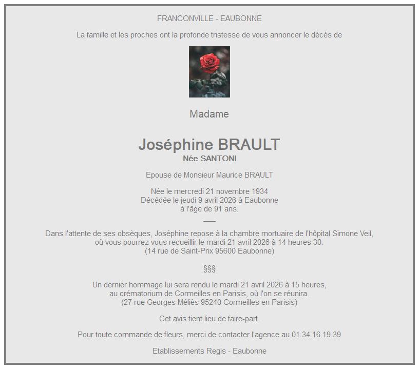 Cet espace « condoléances » est dédié à la mémoire de Madame Joséphine BRAULT née SANTONI.
