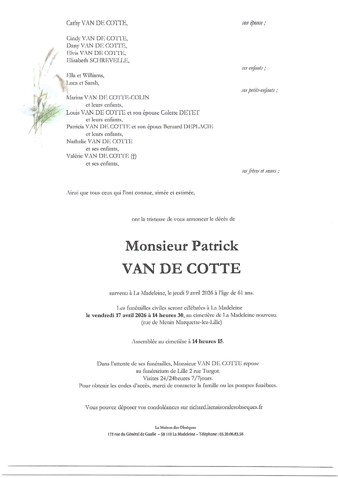 Cet espace « condoléances » est dédié à la mémoire de Monsieur Patrick VAN DE COTTE.