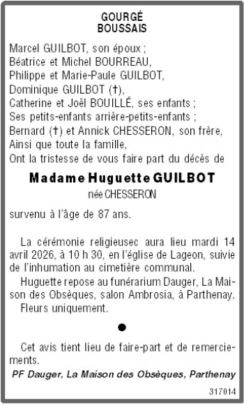 Cet espace « condoléances » est dédié à la mémoire de Madame Huguette GUILBOT née CHESSERON.