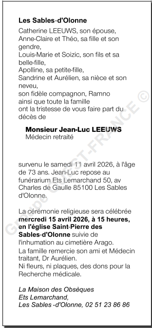 Cet espace « condoléances » est dédié à la mémoire de Monsieur Jean-Luc LEEUWS.