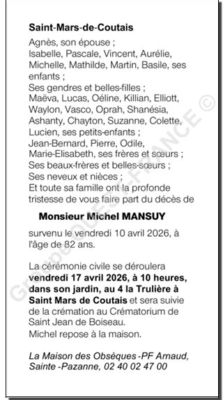 Décédé à Saint-Mars-de-Coutais (44680) le vendredi 10 avril 2026
