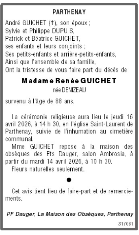 Cet espace « condoléances » est dédié à la mémoire de Madame Renée GUICHET née DENIZEAU.
