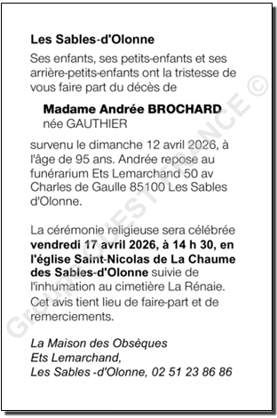 Cet espace « condoléances » est dédié à la mémoire de Madame Andrée BROCHARD née GAUTHIER.