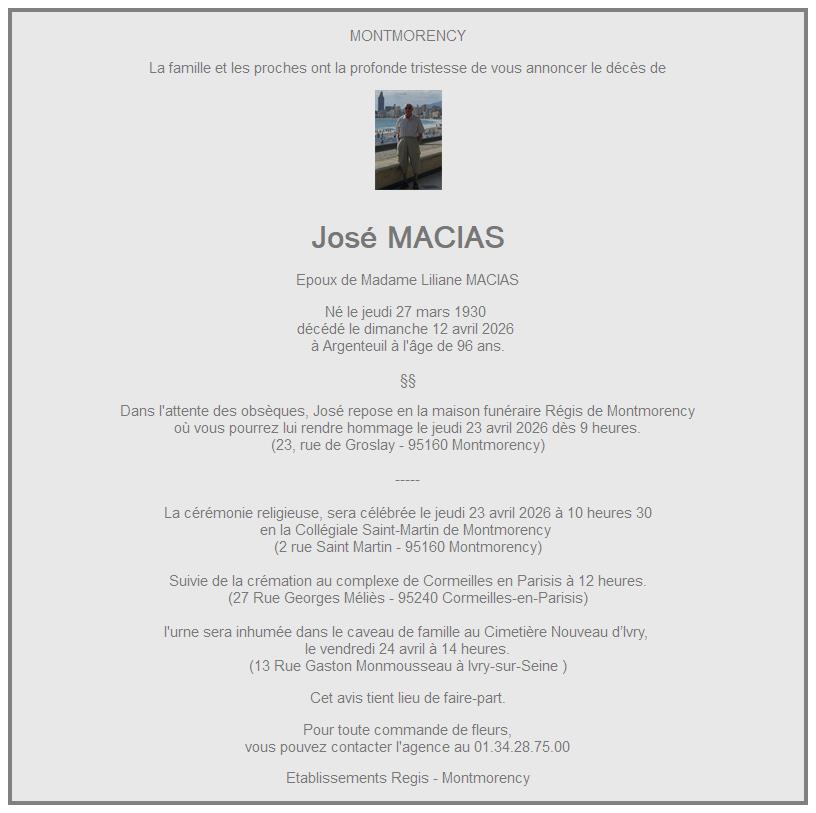 Cet espace « condoléances » est dédié à la mémoire de Monsieur José MACIAS.